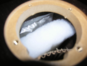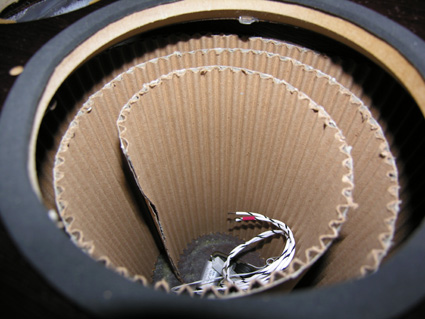 Charge du haut-parleur de l'Héritage A. Celui-ci est constitué en partie d'une spirale en fort carton ondulé, collé rigidement sur le fond de l'enceinte. Ses dimensions et son positionnement ont été longuement mis au point.